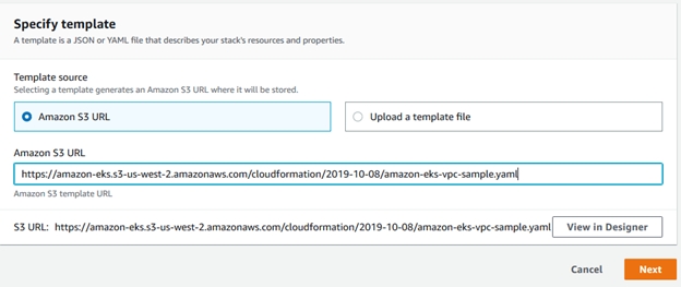 URL: https://amazon-eks.s3-us-west-2.amazonaws.com/cloudformation/2019-10-08/amazon-eks-vpc-sample.yaml