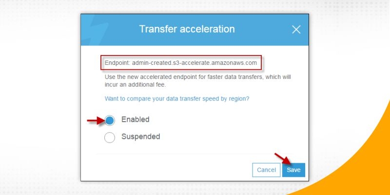Transfer Acceleration enables fast, easy, and secure transfers of files over long distances between your client and an S3 bucket. It makes use of optimized network protocols and the AWS edge infrastructure. As the data arrives at an edge location, data is routed to Amazon S3 over an optimized network path. Transfer acceleration for S3 buckets can be enabled from the Management console. Transfer speed improvements from 50% - 500% are observed.