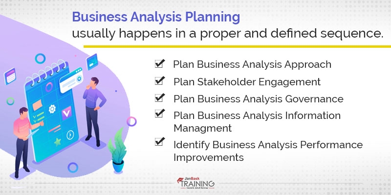 Business Analysis Planning helps us to identify tasks that need to be completed for business analysis. Business Analyst needs the information to identify stakeholders, define roles and responsibilities, develop estimation, plan communication, and determine deliverables. All these form the basis of the analysis plan.