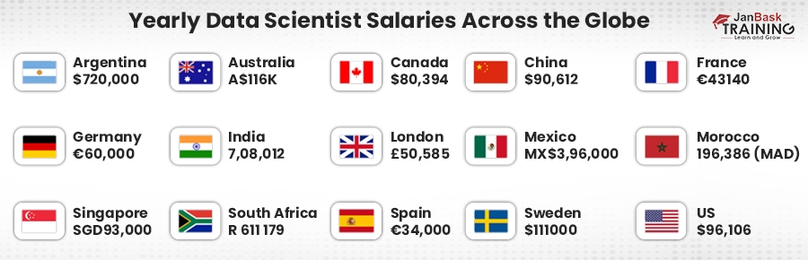 To take the career opportunity in Data Science, one must keep on updating his skills, and it is quite clear from the above statistics that the person having more skills will have more chances to get higher salaries. Here is the average Data Scientist salary across the globe-