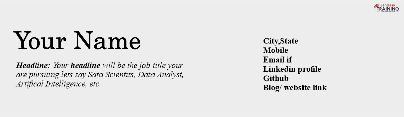 The headline should be the job title you are applying for. Instead of an objective or summary, mention the title of the job you're applying for under your name on your resume. This should be a goal-oriented statement. When aiming for the role of Data Scientist, your headlines should mention it under your name. Read the job description carefully, and use skill-related keywords in the headline.