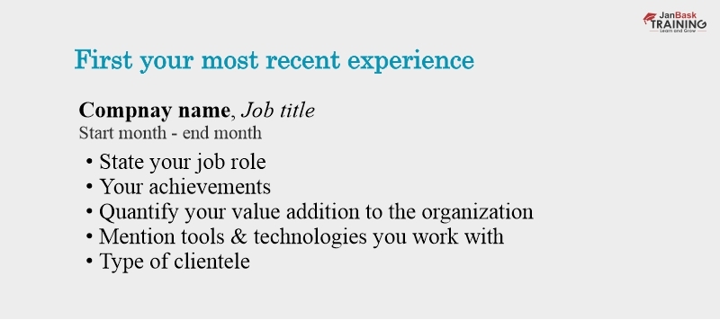 The focus of your CV should be on the projects you've worked on, whether for a corporation or yourself. Always make an effort to quantify the influence of your work. When discussing your previous experience, your goal is to persuade the individual who is presently examining your resume that you will add value to their firm. This is not the place for modesty. Here are some essentials for a Data Scientist resumes concerning experience and projects: