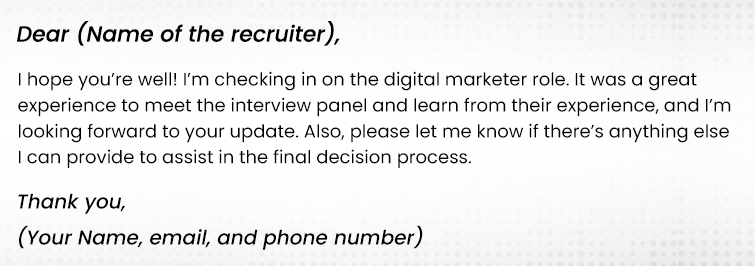 If you have not received any call or email from the potential employer, you may send a “checking in” email to the recruiter even after your post-interview follow-up email.