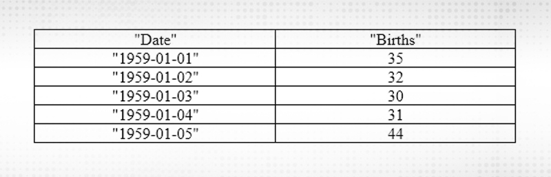 Below is a sample of the first 5 rows of the dataset, including the header row describing the number of daily female births in California in 1959.