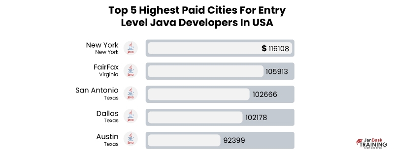 According to Glassdoor's analysis, a Java developer with 1-3 years of background in the United States can make an average annual salary of USD 93,118. Entry-level developers can earn an average of USD 73,839. Furthermore, Java developers with more than six years of experience can earn an average annual salary of USD 99,463, while senior developers with more than ten years can earn an average yearly salary of USD 104,932.