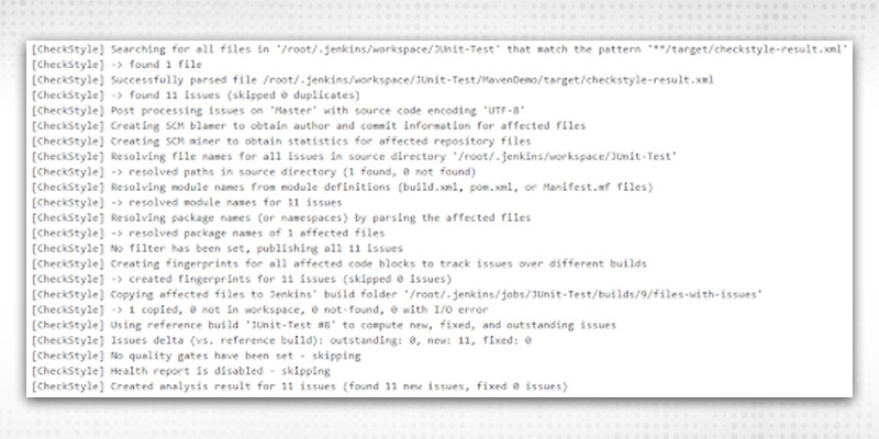 This will enable the reporting of check style results, with a configuration file(required). Put your checkstyle.xml file which is required to have all modules utilized to capture the results, if the developer’s code is following best practice or not.