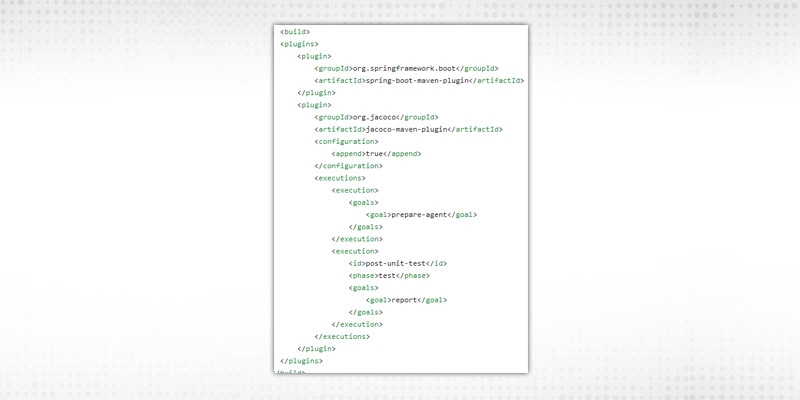 Open your pom.xml and include the following code. We will be using default tool “Jacoco” for code coverage: