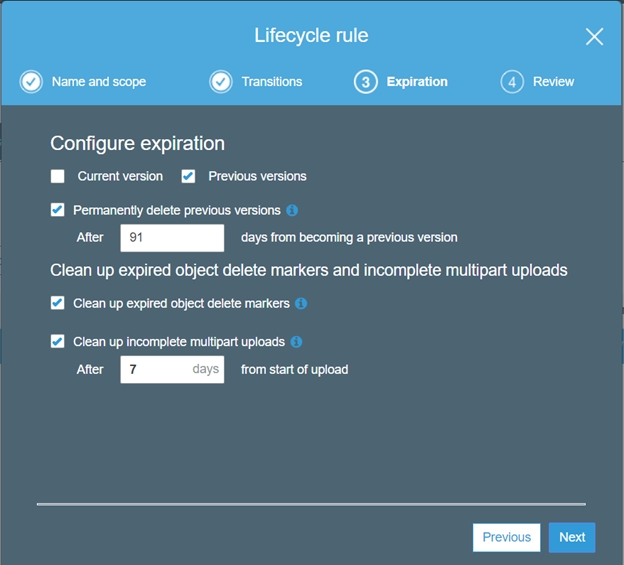 Expiration - Delete an expired object,after a specific number of days. It defines when an object is expired and hence is deleted from S3.
