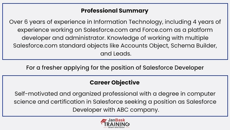 A resume summary is a precise description (around 2-3 lines) of your professional experience. However, if you are a fresher, you should use a resume objective. Otherwise, you should utilize a resume summary in almost all situations. For example, in your professional summary, you may mention some of your outstanding accomplishments, years of experience, your profession, and your core Salesforce developer responsibilities..