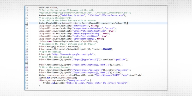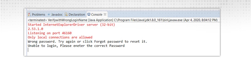 Explanation of the code: Hereafter entering the password, the Error message will populate. So we are storing the wrong password text message in a web element and verifying it. If it contains the string ‘Wrong Password” then Script will print the error message “ Unable to login, Please enter the correct password”.