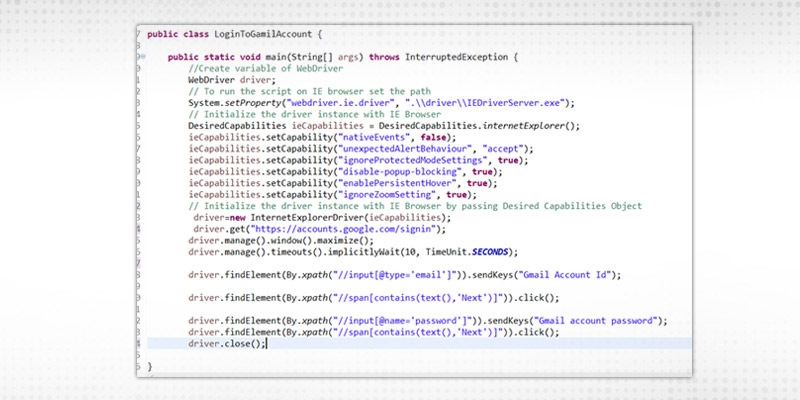 ieCapabilities.setCapability("disable-popup-blocking", truStep 4: Launch the browser and Maximize the window and Apply the implicit wait