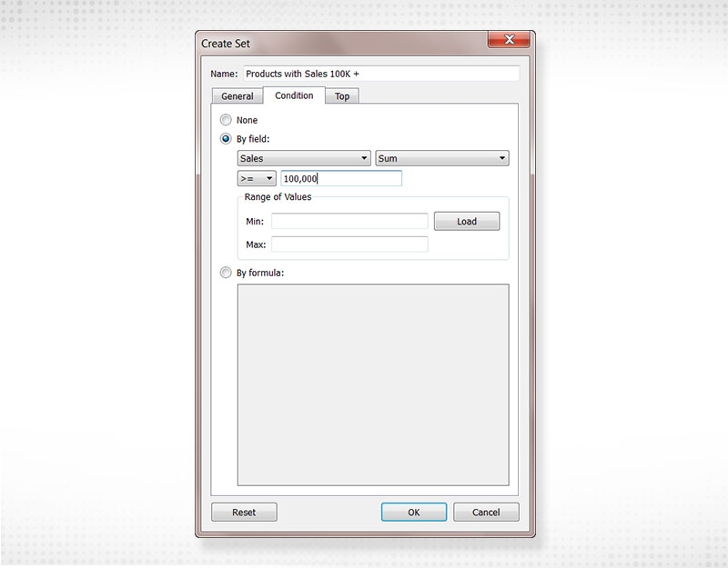 5. The next tab is called a condition. Here you can create a set based on the conditions given. By default, none will be selected but if you want to apply some condition based on the field, you can select by a field radio button. Later you can write about your conditions. These conditions may be a total profit greater than 5000 or sales less than 50000 or similar. The best thing is you can even provide the range of the value. For example, if I want only those members in my set where the cells should lie between 10000 to 20000. Then for such cases, you can use a range of values option. If you are not sure what the minimum and maximum value of a particular major is, you can use the Load button to load the minimum and maximum value of that particular measure. At last, if the field option is not working great for your requirement, you are always independent to write your custom code. For that, you can select by a formula radio button. Here, you can write the code in the same way you write a calculated field.