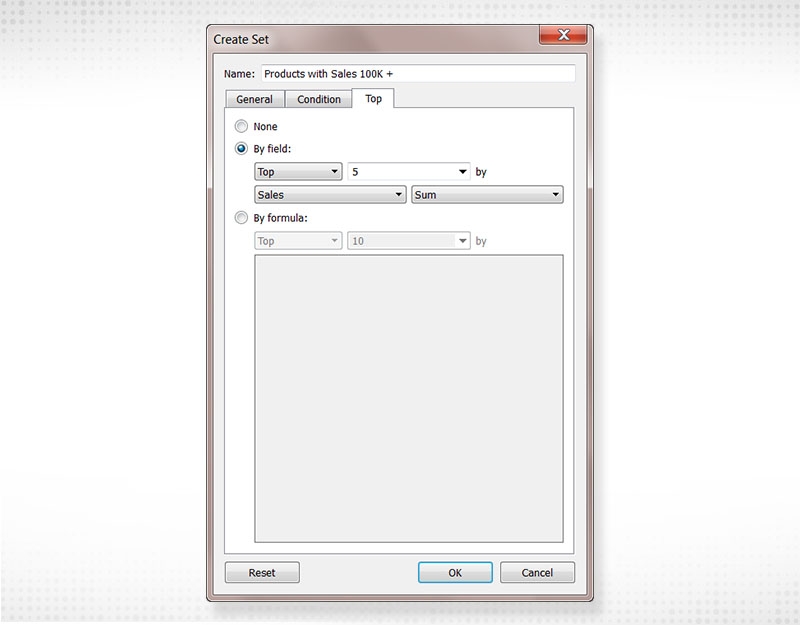 This way, you will be able to create a set with 10 members and ocean members will be the highest sales state. For that, you can also apply the formula here if the first option is not working for you. Again, you can write the formula the way you write a calculated field.