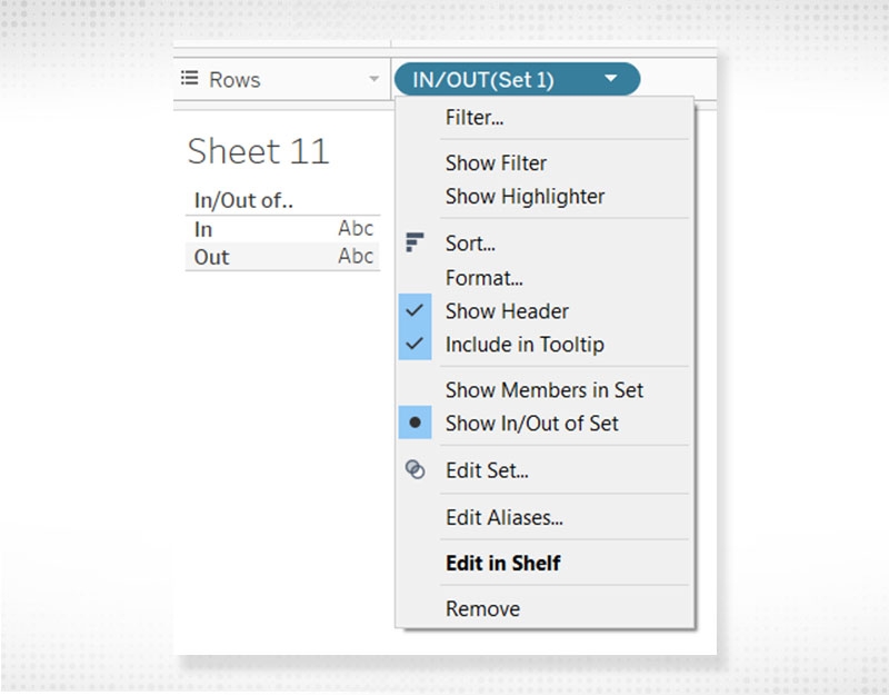 When you will drag the set into the row shelf or into the filter shelf, you will find two options being shown over there-
