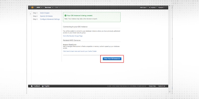 Next, we will use Amazon RDS to create a Microsoft SQL Server DB instance. This will have a storage capacity of 20GB and automated backups enabled. The retention period of the backup is one day.