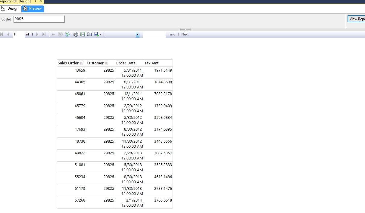 To view the report we need to provide value in the custid textbox and click on submit. The result looks like below.