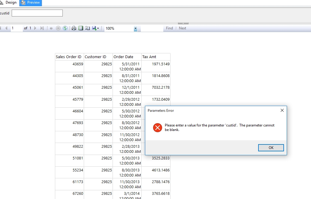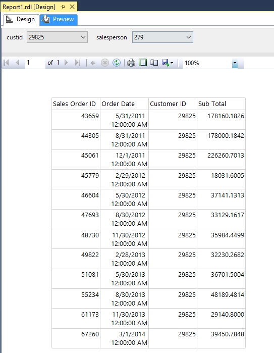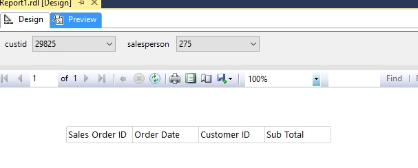 As you can see there is a basic drawback in the design of the report. The user needs to know the exact combination of the customerid and corresponding salespersonid to generate the report properly. Otherwise, the report will show blank data like below.