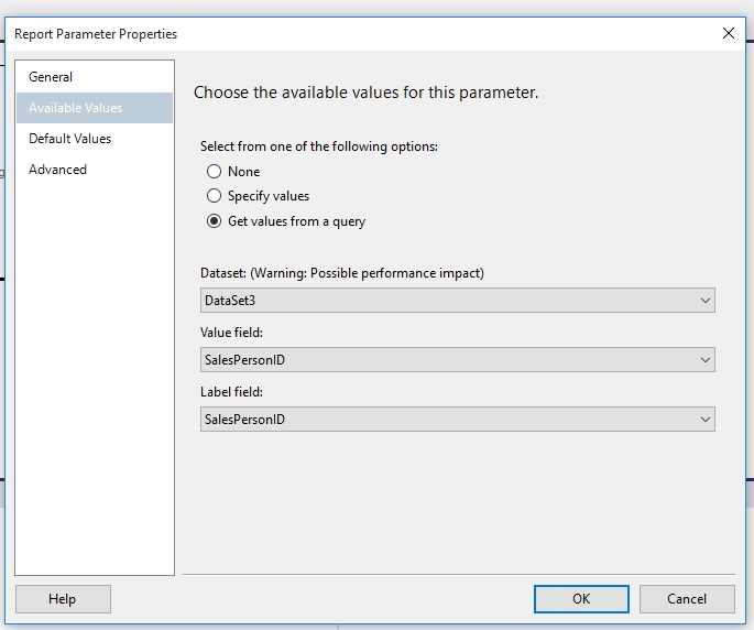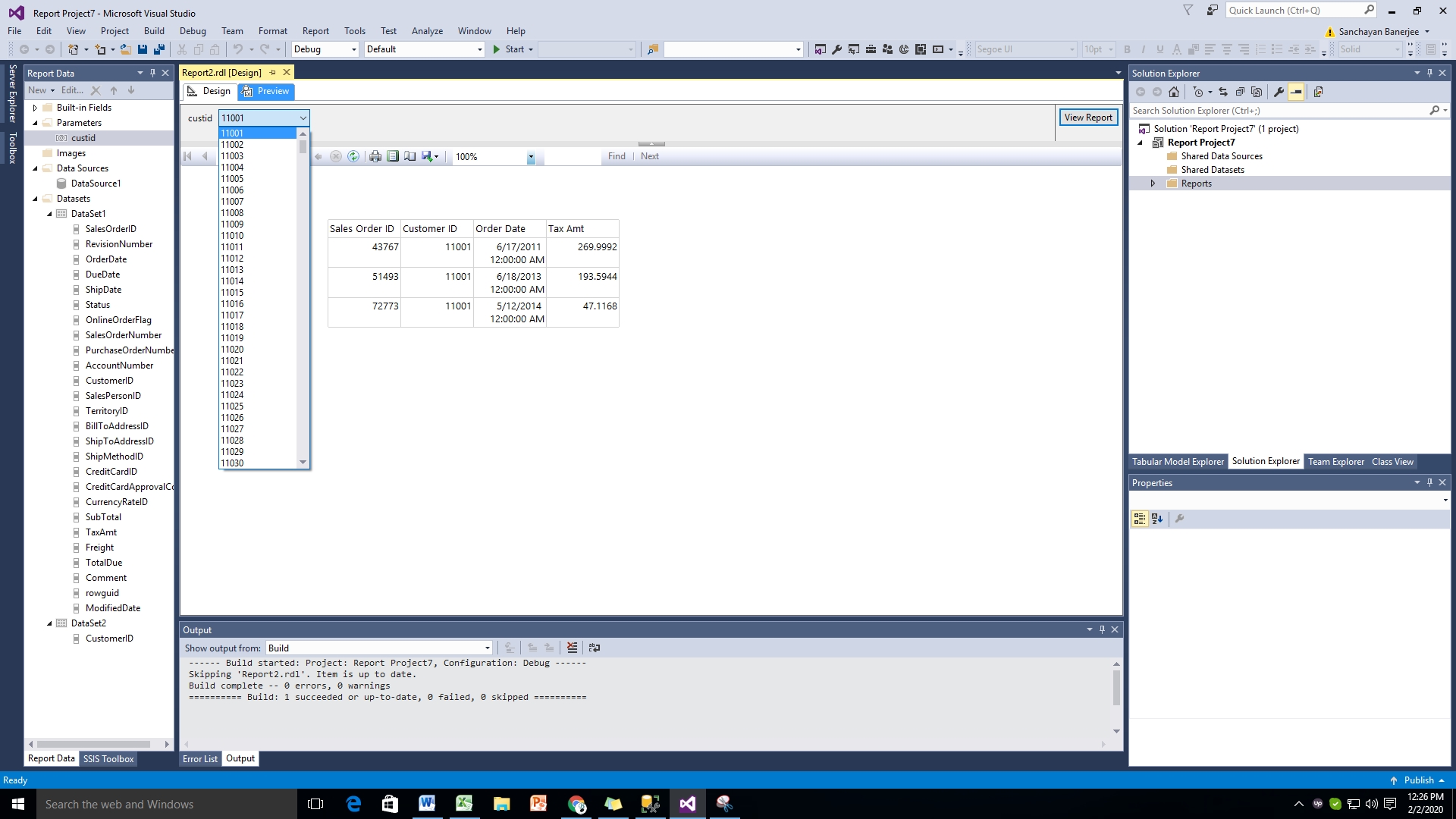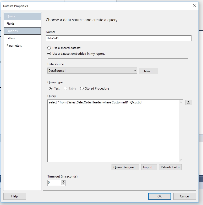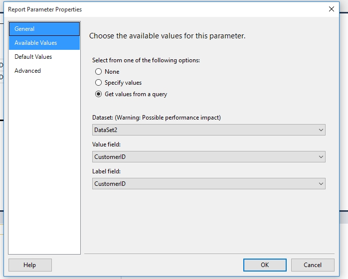 We need to create two datasets, one for the main report which will have parameters defined against the customerid and another to return the customerid values for the customerid parameter. Here is how we would define the two parameters.