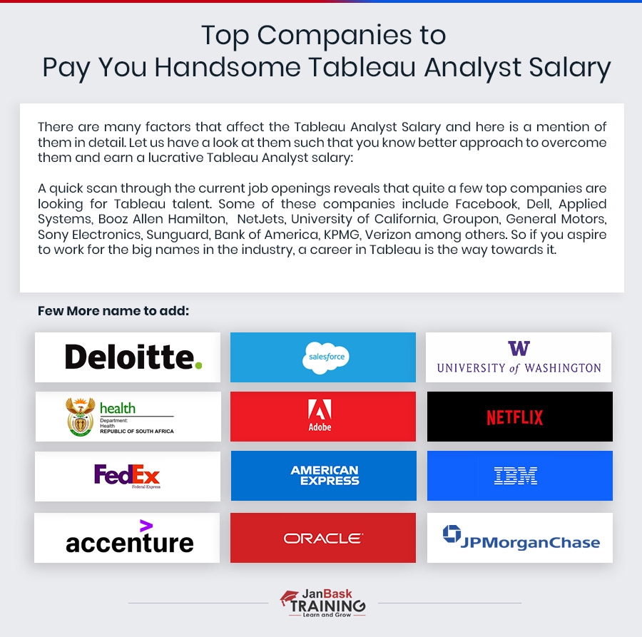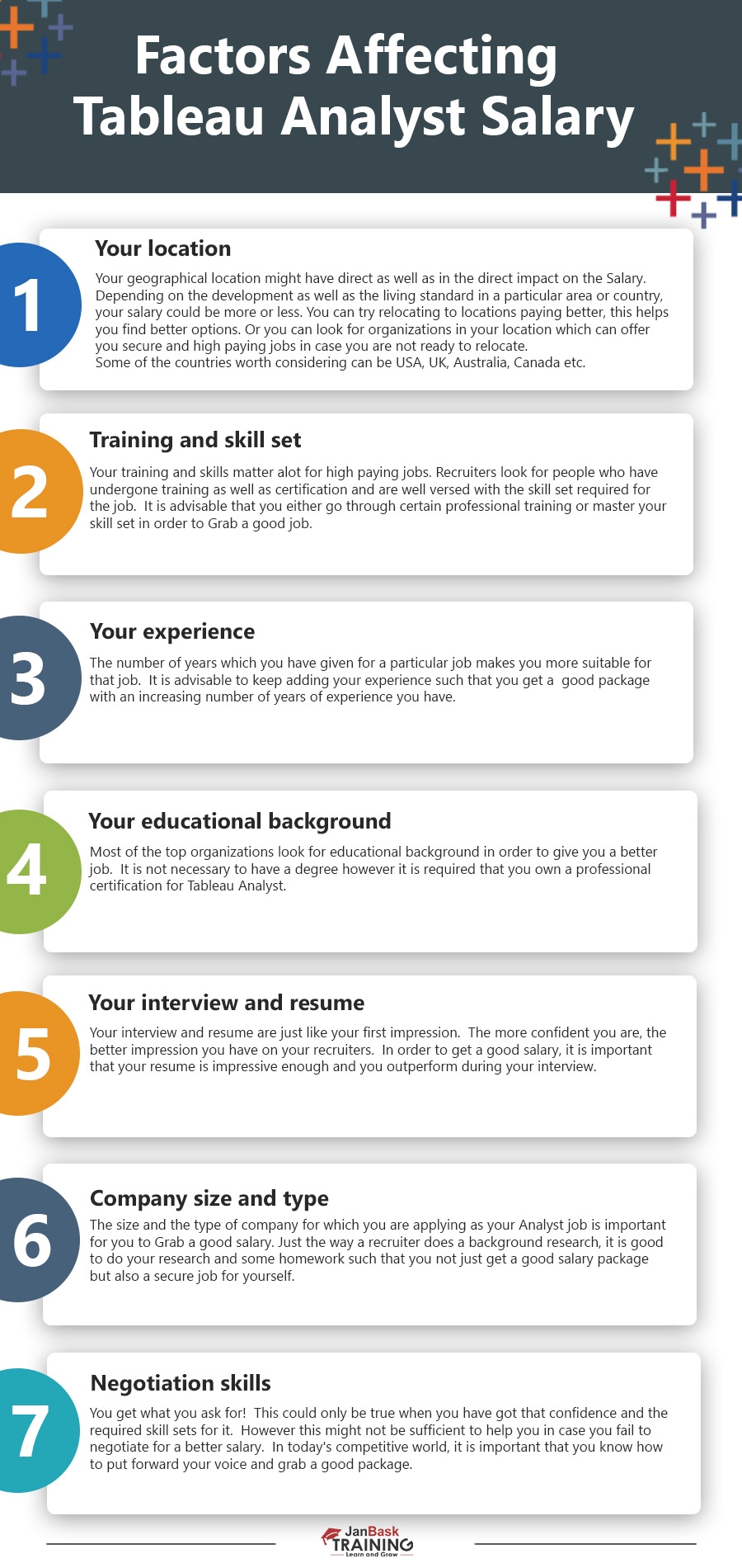 There are many factors that affect the Tableau Analyst Salary and here is a mention of them in detail. Let us have a look at them such that you know better approach to overcome them and earn a lucrative Tableau Analyst salary:
