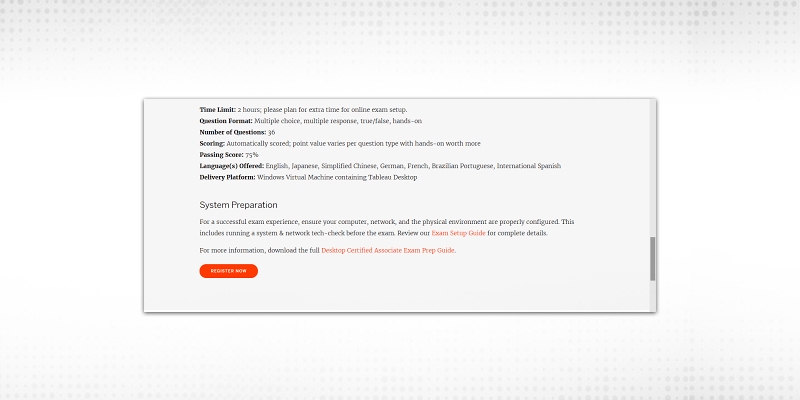 If you are studying for this exam alone, you better have the best of material around you in the form of free how-to videos, visual analytics, or Tableau desktop guide books from online stores. You can even consult the Tableau support or help documentation available on its official website.