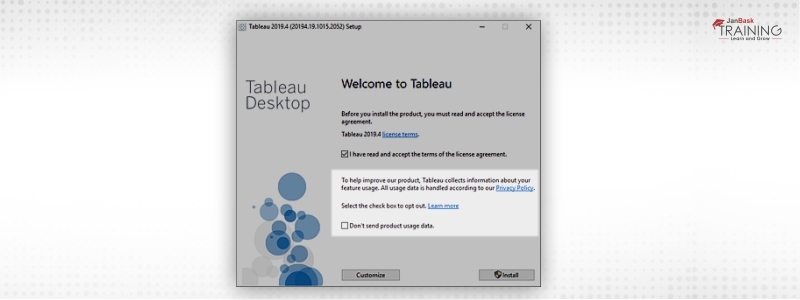 Here you can either select that checkbox or leave it as it. This for the company and if checked, the company will be getting your usage data for improving the product and its configuration. You can even click on the customize button to make more customization which can include the location selection, configuration of the software and more.