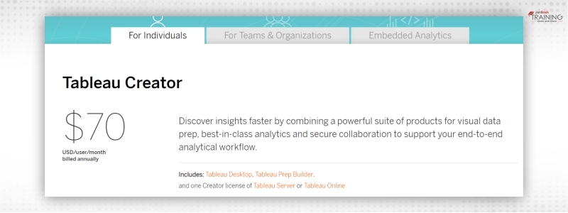 For teams and organizations, there are different pricing options. Like Tableau creator for $70 per user per month where you get all the tools as shared above. The other option is Tableau explorer which comes at $35 per user per month and in this option minimum, 5 licenses will be required. In this case, you’ll get the explorer license of Tableau server.
