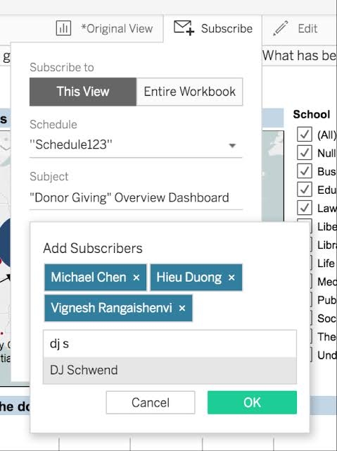 This is a great future with a tableau server where you can subscribe to a report. You have the option to subscribe to just a single view of the entire dashboard. You may choose when you want the delivery in your email inbox.