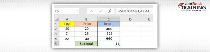 In the example above, we carried out the calculation of the subtotal on cells ranging from A2 to A4. As you can see, the function used is “=SUBTOTAL(1, A2: A4), in the subtotal list “1” refers to average. Thus, the above function will give the average of A2: A4 and the response to it is 11, which is stored as C5.