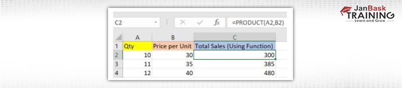 This example below shows how we used the - ‘PRODUCT' feature to multiply. As you can see, we didn’t use the mathematical operator here.