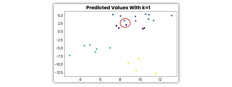 It's very crucial to evaluate an absolute k value. If the value is low, the model is more specific and not generic well. Also inclined to be perceptive toward the noise. The Nearest Neighbors model achieves great accuracy on the training set but will poorly predict new, earlier unperceived data points.
