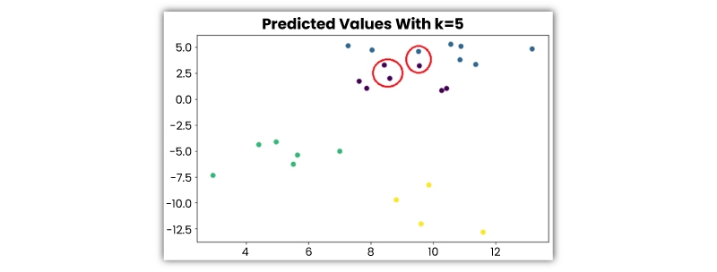 Using majority rule kNN classifiers evaluate the data point’s class. Let’s consider an example of  machine learning algorithm- if a value of k is 5, then the classes of 5 closest data points would be checked. As per the majority class, predictions are made.