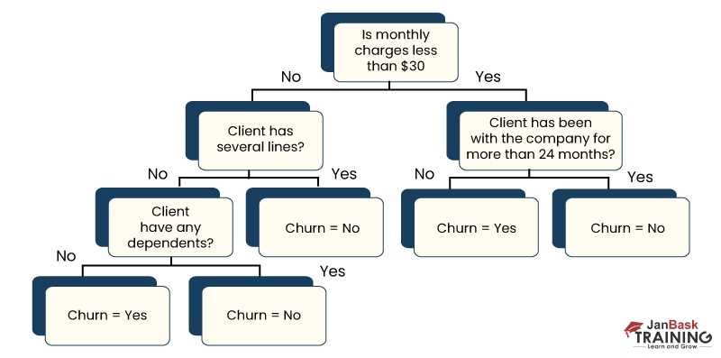 Above is a decision tree to forecast client churn. The first segregation is in accordance with the amount of the monthly charge. Then the machine learning algorithm keeps on asking questions to individual class labels. The questions tend to become more precise as the decision tree gets deeper.