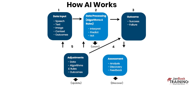 Here are underlying principles and techniques behind AI, including machine learning, neural networks, and algorithms. By understanding the fundamentals of AI, you'll gain insights into how machines can perceive, learn, reason, and make decisions. So, let's delve into the inner workings of AI and uncover the magic behind this transformative technology.The general steps involved in the functioning of AI systems are as follows: