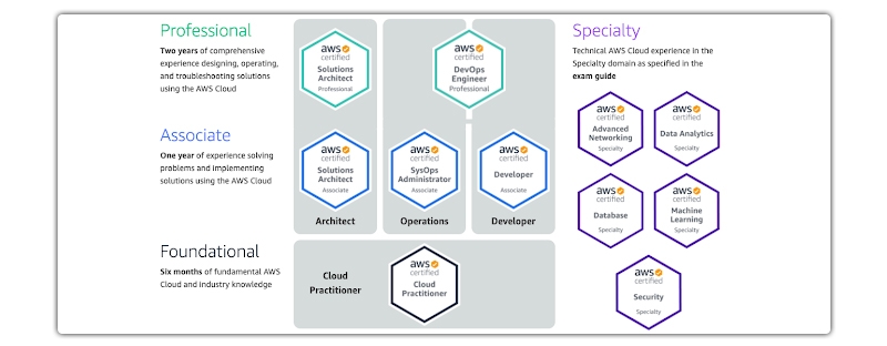 These certifications validate an individual's knowledge and expertise in specific AWS services and technologies areas. The Foundational level is intended for individuals new to AWS, while the Associate level is designed for individuals with some experience in AWS. The Professional level is intended for individuals with extensive experience in AWS. In contrast, the Specialty level is designed for individuals with networking, security, machine learning, database, data analytics, and Alexa Skill building expertise.