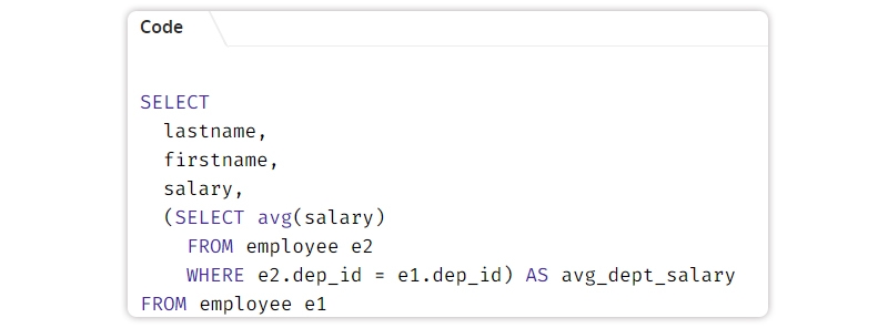 The point of difference between a SQL correlated subquery and a normal subquery is that correlated subqueries depend on and take references from the outer table. In the example given above, e1.dept_id is a reference to the outer subquery table.
