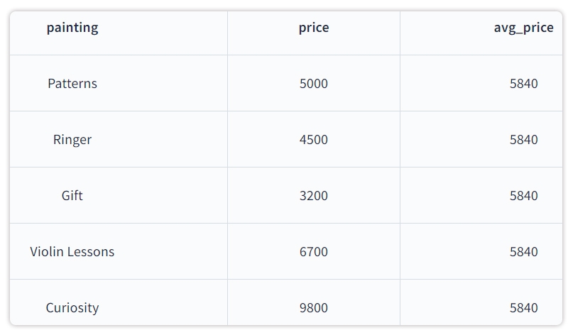 This SQL query shows the average price of paintings whose price is higher than 5000 than the real price. The output resembles this: