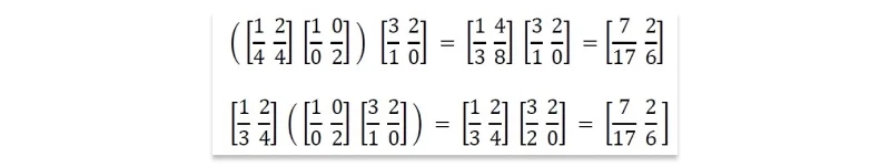 Matrix multiplication is associative: Associativity grants us the right to parenthesize as we wish, performing operations in the relative order that we choose. In computing the product ABC, we have a choice of two options: (AB)C or A(BC). Longer chains of matrices permit even more freedom, with the number of possible parenthesizations growing exponentially in the length of the chain. All of these will return the same answer, as demonstrated here: