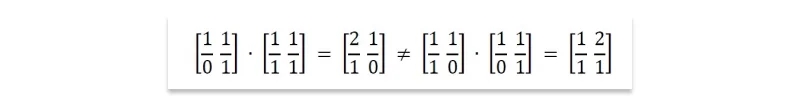It does not commute: Commutativity is the notation that order doesn’t matter, that x · y = y · x. Although we take commutativity for granted when multiplying integers, order does matter in matrix multiplication. For any pair of non-square matrices A and B, at most one of either AB or BA has compatible dimensions. But even square matrix multiplication does not commute, as shown by the products below: