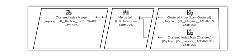The initial step in this task involves scanning the source and target tables (query plans are read from left to right). Notably, creating indexes on the columns that link the Original and Replica tables for effective merging becomes evident. To optimize read performance, the query optimizer employs a clustered index scan, especially when the join attribute utilizes the primary keys of both tables. Therefore, it is recommended to establish an index (preferably unique, and ideally clustered) on the columns involved in joining the two tables.