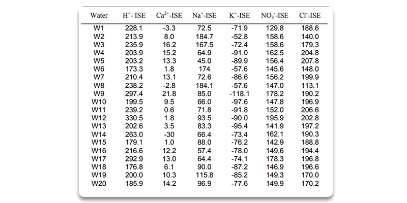 Following is the full Data-Set for Mineral water samples named W1-W20, and Values of Electronic potential are mentioned in mV: [Image source - rsc.org]
