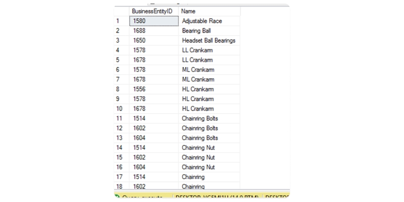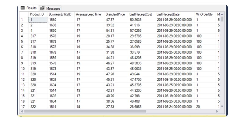 Below is a selection of the ProductVendor table. The select query is as follows: