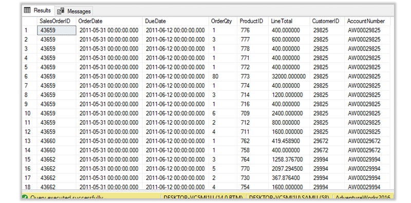 select slordh.SalesOrderID, slordh.OrderDate, slordh.DueDate, slordd.OrderQty, slordd.ProductID, slordd.LineTotal, slordh.CustomerID, cust.AccountNumber from [Sales].[SalesOrderHeader] slordh inner join [Sales].[SalesOrderDetail] slordd on slordh.SalesOrderID=slordd.SalesOrderID inner join [Sales].[Customer] cust on slordh.CustomerID=cust.CustomerID