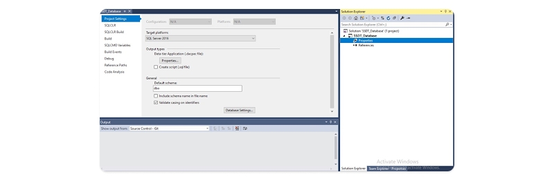 7. In Solution Explorer, right-click the SSDT_Databse project and choose Properties. Select the Project Settings tab and ensure the Target platform is SQL Server 2016. On the toolbar, click Save Selected Items, then close the account.